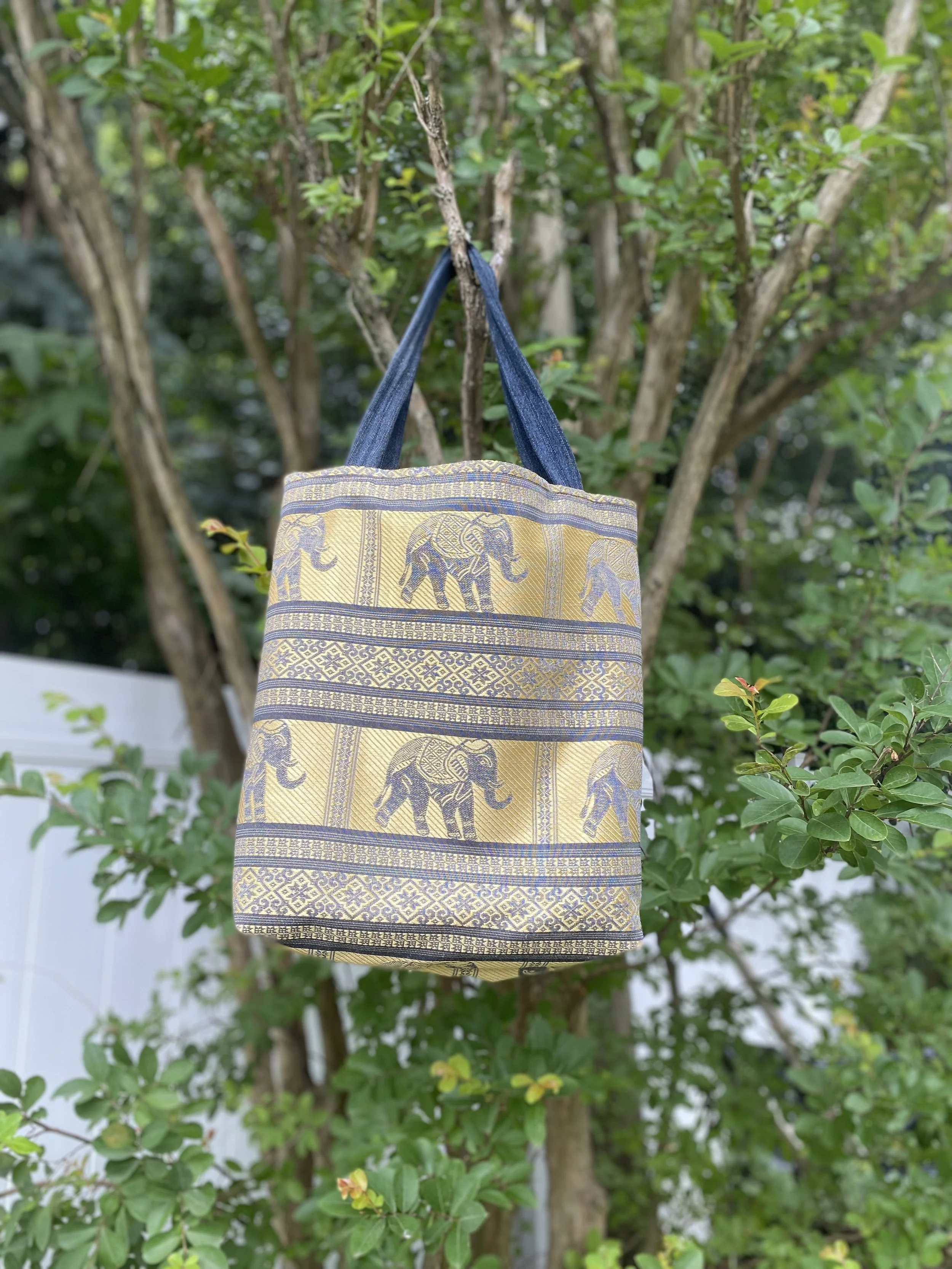 Elephant design is on the outside. Lao and Southeast Asian mix batik print on the inside. The strap is upcycled denim. Please note that the lining fabric and print can vary as it is locally sourced material.